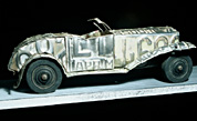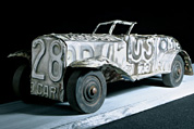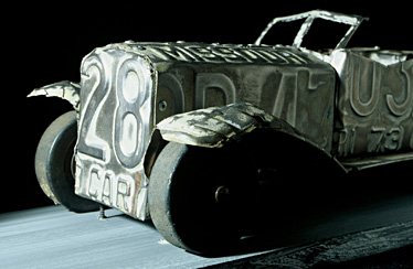 This piece was my submission to a show title ‘ ? ‘. Since I was a child I have been identifying cars by studying their overall shape and form down to the details of light placement and shape of the bumper. I had a vision for this car and started by forming the front fenders, radiator shell, and hood. Working back to the windshield, interior, trunk and rear fenders happened in one sitting with no revisions. As often happens his ‘sketch’ turned out to be the finished piece. Paint remover was used to patina the piece after it was built.